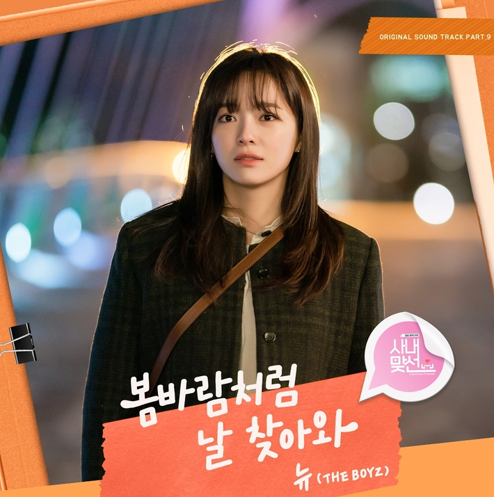 사내맞선 10회에서는 그룹 '더보이즈' 멤버의 뉴의 '봄바람처럼 날 찾아와'를 런칭하게 됩니다. 이승철, 빅마마, 소녀시대 서현 등과 작업한 경험을 가진 박영민 프로듀서와 최팽이 프로듀싱을 맡으면서 애틋한 가사와 감성을 더한 음원입니다. 29일 오후 6이 음원차트를 통해 공개될 예정이라고 합니다.