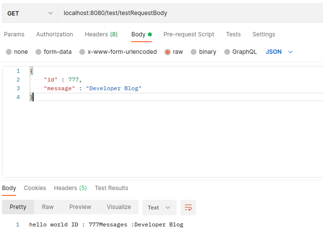 위 예제에서 매개변수로 DTO 클래스의 오브젝트를 매개변수로 받아 오브젝트의 id와 message를 리턴하고 있다. postman에서 localhost:8080/test/testRequestBody로 id와 message를 BODY에 태워서 요청하면 정상적으로 DTO 오브젝트의 멤버를 반환한다.