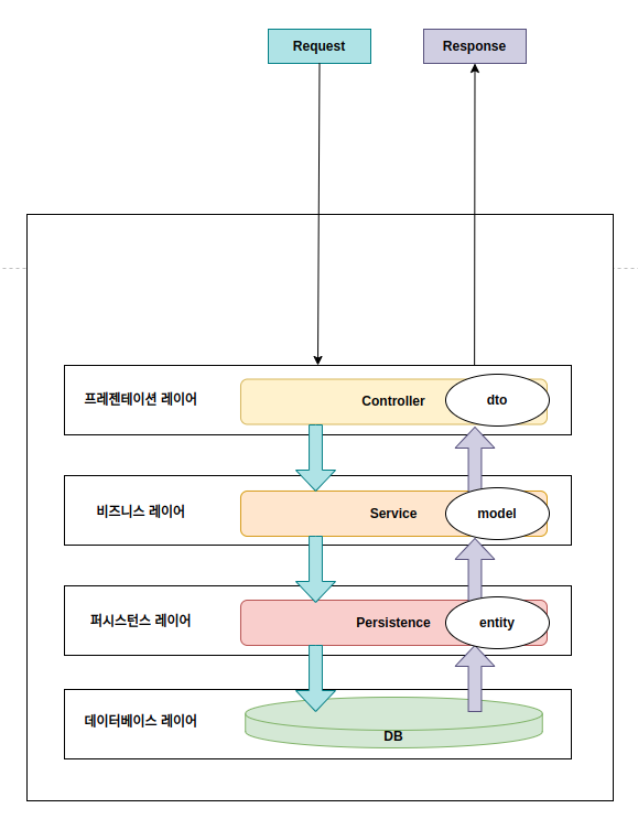 레이어드 아키텍처 패턴은 층을 가지고 있다. 한개의 레이어는 자기보다 하위의 레이어만 사용하게 된다. 스프링부트 애플리케이션의 레이어는 컨트롤러, 서비스, 퍼시스턴스, DB 4개의 레이어로 구성되어 있다. 먼저 사용자가 보낸 요청을 컨트롤러가 받는다. 컨트롤러는 서비스, 퍼시스턴스로 요청을 보내고 최종적으로 DB에 접근해서 데이터를 가져와 사용자에게 응당합게 된다.