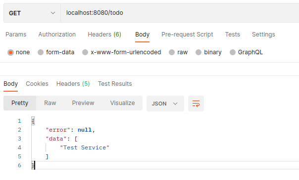 이제 postman에서 localhost:8080/todo로 GET 요청을 보내면 "First Project Item" 문자열이 반환되는 것을 확인할 수 있다. 컨트롤러에서 TodoService로직을 작동시키고, 서비스 로직에서 엔티티를 생성/저장/검색의 과정을 거쳐서 ArrayList로 반환된 데이터를 담게 된다. 이 데이터를 ResponseDTO로 담아서 출력하게 되는 과정이다.