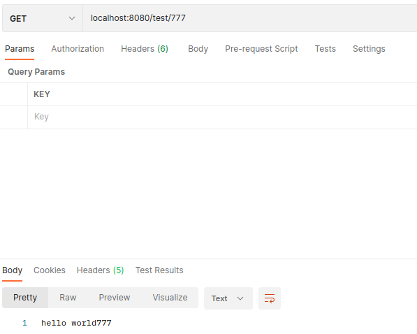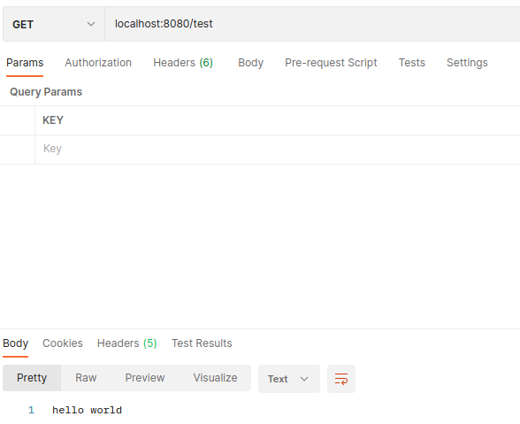@RestController 어노테이션은 해당 컨트롤러가 RestController임을 명시한다. 이는 요청/응답 매핑을 스프링에서 자동으로 처리하게 된다. 스프링은 @RequestMapping("RESOURCE")는 URI에 매핑하고, @GetMapping은 메소드에 매핑한다. 이 뿐만 아니라, @PostMapping, @PutMapping, @DeleteMapping 등 HTTP 메소드와 연결된 어노테이션이 존재한다. 이제 컨트롤러를 postman에서 실행시켜 보면 정상적으로 "hello world" 리턴값을 얻을 수 있다.