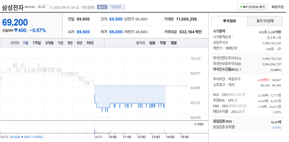 2022년 대한민국 시가총액 기준 가장 비싼 기업은 단연코 삼성전자다. 시총 413조원으로 LG에너시 솔루션(100조원)보다 4배다 높은 가치를 가지고 있다. 핸드폰 부터 가전제품, 반도체 까지 생산 및 수출하면서 사실상 '삼성전자 공화국'이라는 말이 나올정도로 강력한 경쟁력을 가지고 있는 기업이다.