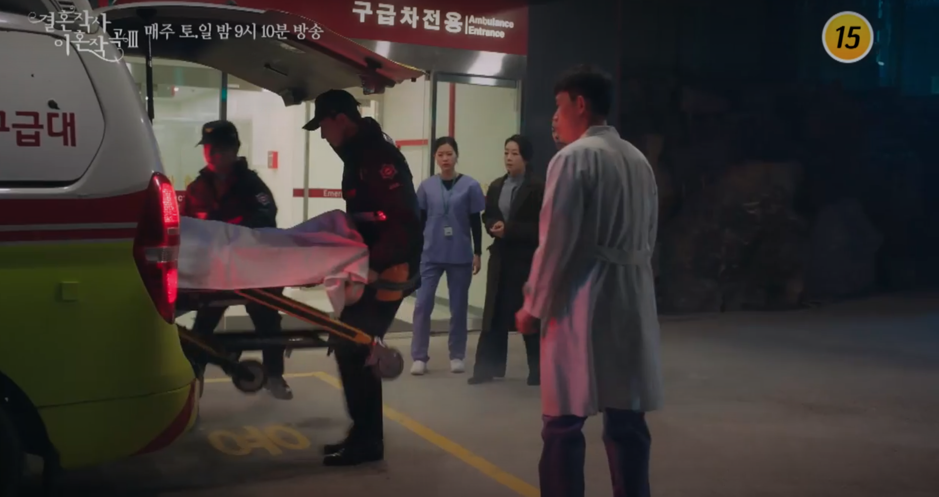 동마의 아버지는 물건을 다 정리했냐고 물어봅니다. 구급차에 실려 병원으로 온 누군가에게는 하얀 천이 덮어져 있습니다. 사망사건이 일어났고, 시은과 피영은 검은옷을 입고 장례식에 참여합니다. 동마, 동마의 엄마, 아니면 서반이 죽은건가요.. 시은의 비통한 표정으로 미루어봤을 때 사망한 인물은 서반이 아닐까 하는 추측입니다.