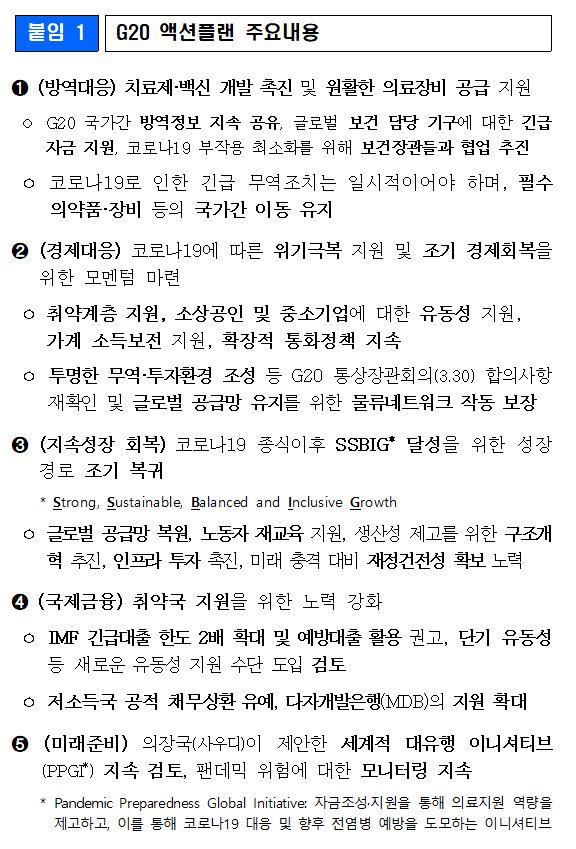 G20국가들은 재무장관 회의를 개최하여 세계경제가 -3.0%의 역성장이 예상되는 가운데 시장의 커다란 위기극복 시그널을 보내는 G20 액션플랜 도출에 합의하였다. G20 액션플랜은 방역과 경제를 아우르면서 방역대응, 경제대응, 국제금융, 코로나 19 종식 후 지속성장 회복, 미래준비 등의 과제를 담고 있다.