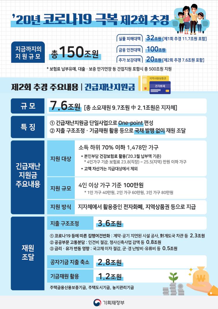 금번 2차 추경안의 핵심내용은 7.6조 원 규모의 긴급재난지원금 재원 마련이다. 지원대상은 소득 하위 70% 이하의 1478만 가구이며, 4인 가구 기준으로 100만 원의 지원금이 책정되었다. 지급방식은 전자화폐 혹은 지역상품권으로 지급된다. 총 소요자원은 9.7조 원이며 중앙정부 7.6조 원에 지방정부 2.1조 원을 협동으로 마련하게 된다. 중앙정부는 국채 발행 없이 공무원 인건비를 절감하고 예비군 훈련을 연기하는 등 지출구조조정과 주택금융신용 보증기금, 주택도시 기금 등 기금 재원을 활용하여 지원금 재원을 마련한다.