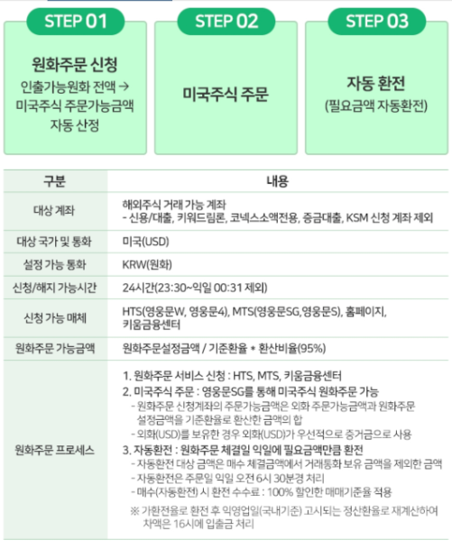 해외주식 매수를 위해서는 원화(KRW)이 아닌 달러(USD)가 필요합니다. 환전은 영웅문S 메뉴>환전업무에서 진행합니다. 오후 4시까지 환전이 가능하며, 만약 4시 이후 환전을 하신다면 미국주식 원화주문설정금 설정에서 가환율을 적용해 환전을 할 수 있습니다.