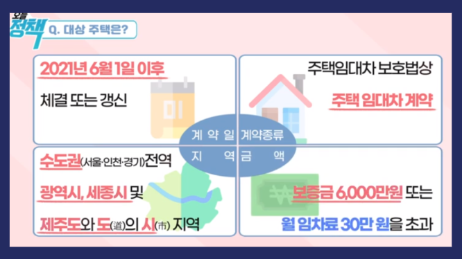 ② 전월세 상한제 : 임대차 계약 갱신 때 최대 상향 보증금은 5%로 제한됩니다.