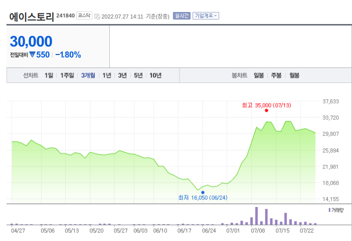 두번째 관련주는 이상한 변호사 우영우 제작에 참여한 에이스토리 입니다. 컨텐츠 사업을 영위하고 있고 드라마 <지리산>을 제작했던 이력을 가지고 있습니다. 방영을 시작한 이후 2배 이상 급등한 상황입니다.