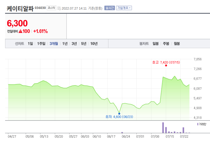 세번째 종목은 케이티알파입니다. 이상한 변호사 우영우 제작에 참여한 스튜디오 지니와 낭만크루가 공동제작하였고, ENA 채널에서 방영중입니다. ENA 채널은 KT의 위성방송의 자회사인 스카이라이프 TV가 운영하고 있으므로 KT 계열입니다. KT 계열사 중 컨텐츠를 담당하고 있는 케이티알파가 세번째 종목으로 선정되었습니다.
