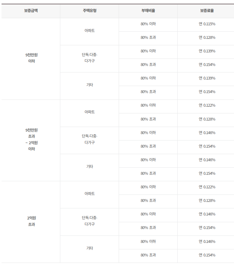 | 보증료율(%) | 아파트 : 0.128% 기타 주택 : 0.154% |
