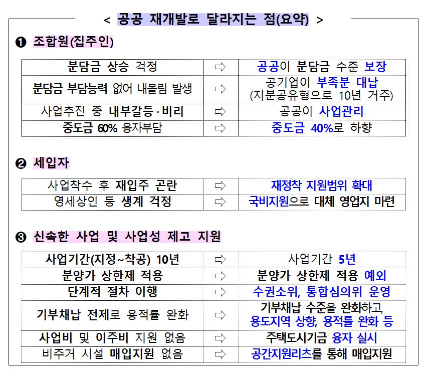 조합 뿐만 아니라 개발지역 내 거주 중인 세입자들 모두 공공임대 입주자격을 제공하고, 사업지 내 영세상인들에게 공공임대상가 등 대체 영업 지를 제공하여 소외계층이 피해를 입는 일이 없도록 조치한다고 한다.