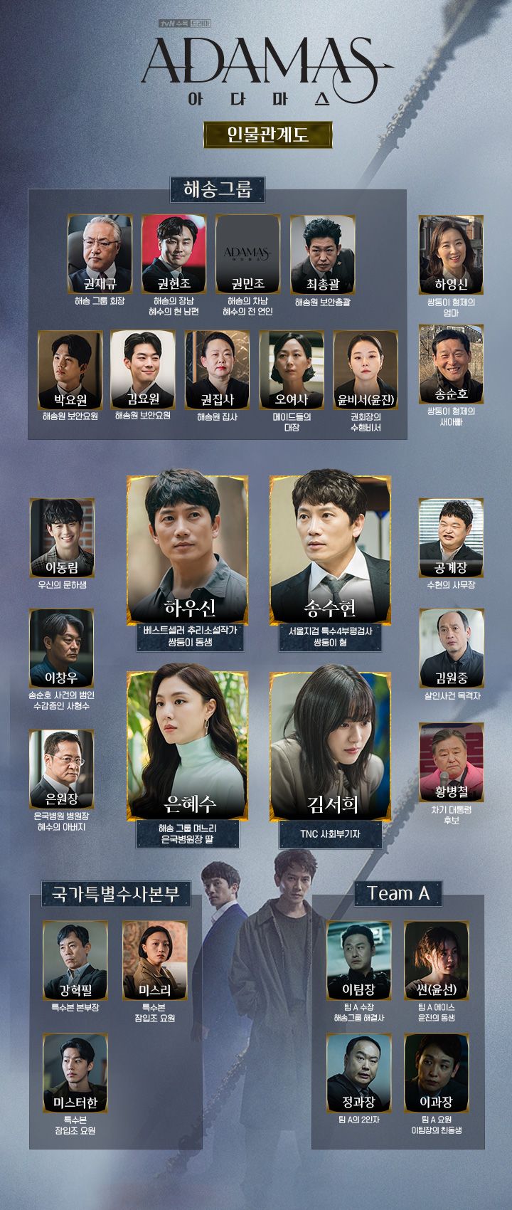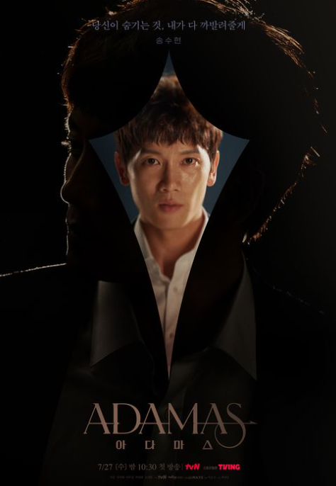 2022년 7월 27일 부터 tvN에서 방영을 시작한 <아다마스>는 계부를 죽인 혐의 누명을 덮어쓴 진짜 아빠의 누명을 벗기기 위해 형은 진범을 , 동생은 살해 증거인 '아다마스'를 찾아나서는 스토리를 담고 있습니다. 억울한 죗값을 치뤄야 하는 친부를 위해 고군분투하는 주인공들의 스토리가 담겼습니다.