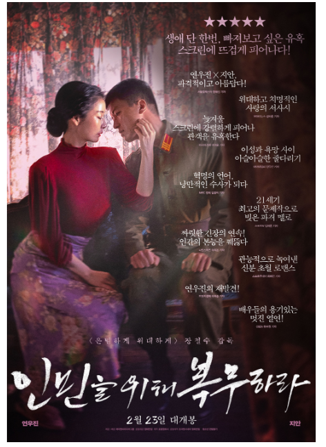 영화 <인민을 위해 복무하라>는 2022년 2월 23일에 개봉했습니다. 북한으로 추정되는 공간에서 사단장의 부인과 병사가 만나게 되면서 벌어지는 치정극 입니다. 청소년 관람불가 등급을 받은 만큼 노출 수위가 높은 장면들이 빈번하게 연출됩니다.