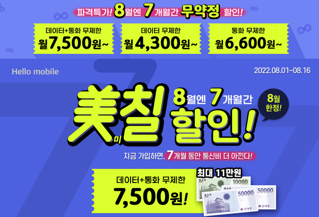 8월에 7개월간 무약정 할인 조건으로 진행하고 있는 행사를 보면 데이터 + 통화 무제한 통신 요금이 한달에 7500원부터 시작합니다. 7만 5천원이 아니라 7천 오백원입니다. 기존 통신사에 핸드폰 약정 요금 + 프리미엄 서비스(빕스, 영화관 할인 등등)이 붙어서 무제한 요금제가 7만원이 넘어가는데, 반에 반에 반값도 안되는 가격입니다.