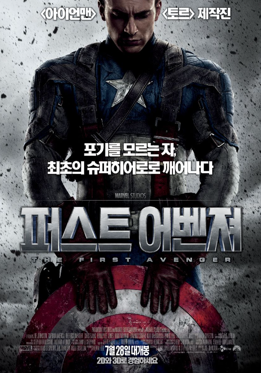 아이언맨, 토르 제작진이 참여하였습니다. 지난 영화가 흥행하다 보니 제작팀이 그대로 혹은 일부라도 계속 참여하는 모습입니다. 세계 전쟁이 한창 벌어지던 1940년대 호리호리한 체격으로 군대에도 입대하지 못했던 스티브 로저스는 미군의 비밀 작전에 참여하면서 슈퍼 히어로가 됩니다. 빵빵한 근육질에 별표가 박힌 방패를 든 캡틴 아메리카의 탄생을 다루고 있습니다.