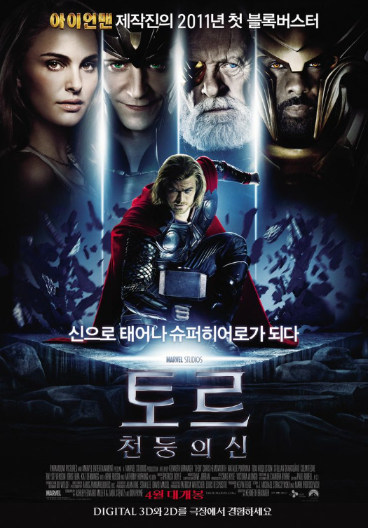 아이언맨 제작팀이 참여하였고, 공간적인 배경이 지구가 아닌 아스가르드에서 오딘의 아들 토르를 주인공으로 한 영화입니다. 크리스 햄스워스가 처음으로 참여하였고, 마블 시네마틱 유니버스의 배경이 확장되는 결정적인 역할을 한 영화입니다.
