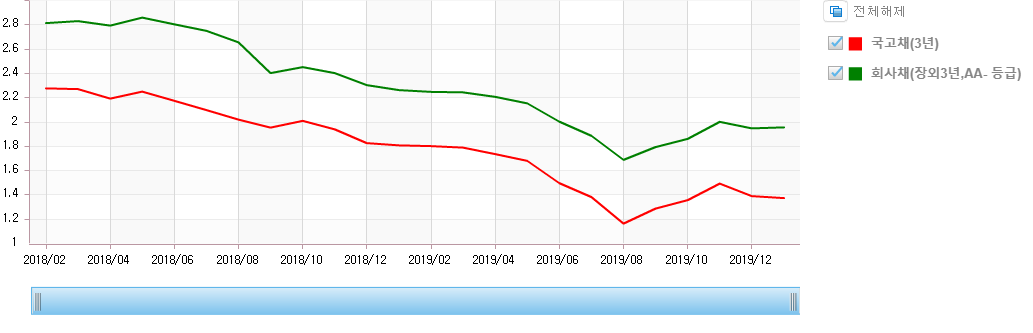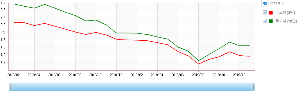 하기 그래프는 2018-2019 장단기스프레드 지표입니다. 2019년8월 경 장단기 스프레드의 격차가 좁아진 이후 확장 국면에 접어 든것을 확인할 수 있습니다.