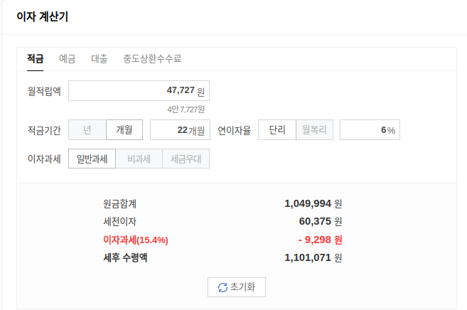 할부이자를 역으로 계산하면 원금 105만원에 대해 매월 세이브 되는 돈의 가치는 적금 넣는다고 생각하면 계산하기 쉽다. 기기값 기준 매월 상환할 금액은 47,727원을 토대로 적금 계산기를 돌려보면 대략 6만원 정도 할인된 가격에 산다는 말이다.