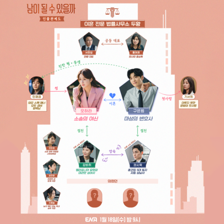 ENA 신작 드라마 남이 될 수 있을가는 최근 증가하는 이혼률이 올라가는 상황에서 생존하는 두 변호사의 사랑과 성장 스토리를 그리고 있습니다. 현재 예고편이 공개되었구요, 두 사람이 전남편, 전 와이프와 사무실을 함께 사용하면서 벌어지는 이야기를 그려내고 있습니다.