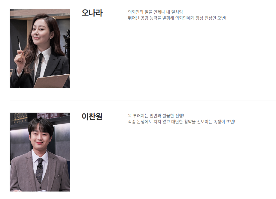 아무래도 법정 예능이다보니 최소 10년 이상의 법조계 전문가들이 나와서 일상속에서 발생하는 다양한 다툼을 재조명하고 있습니다. 알뜰살뜰 법지식을 얻어가기 좋은 프로그램인듯 합니다.