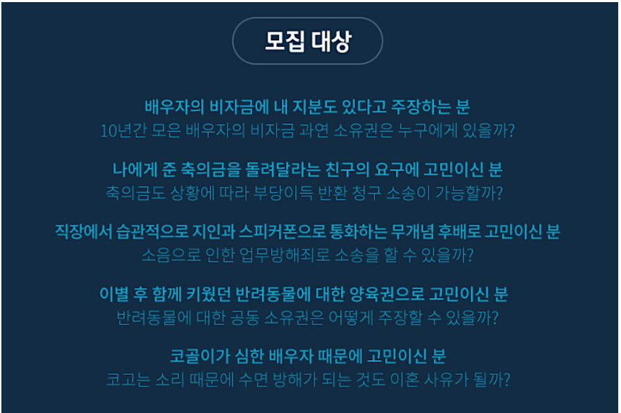 새롭게 시작하는 예능인 만큼, 다양한 소재를 위해 응모를 받고 있습니다. 모집 대상을 보면 일상 생활에서 흔치 않게 볼 수 있는 스토리를 가진 분들을 대상으로 하고 잇습니다. 배우자의 비자금에 내 지분이 있다고 주장하는 분 많죠?