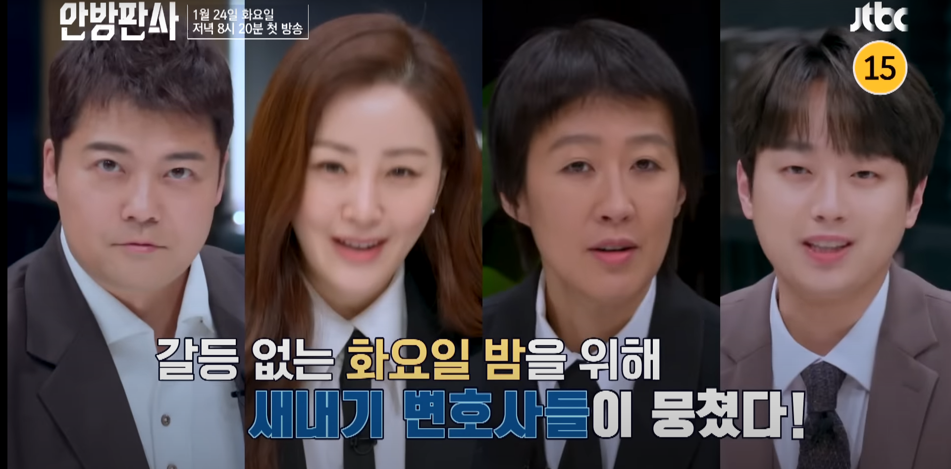 JTBC 새로운 예능 프로그램 안방판사는 인생 속에서 크고 작은 갈등을 법적인 기준으로 재조명 해보는 프로그램입니다. 법 지식이 예능으로 본격적으로 들어오게 되었습니다. 최근 연애 관련 예능이 인기를 얻다가 다양한 포맷을 시도하는 모습이네요.