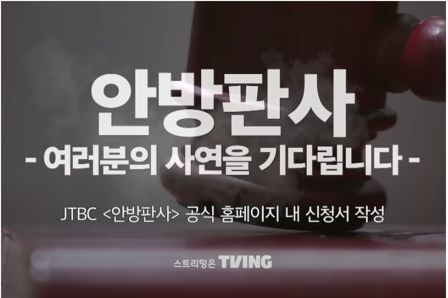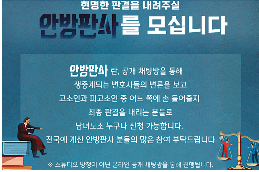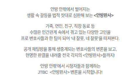 JTBC 안방판사에서는 변호사 뿐만 아니라 시청자들이 고소인과 피고소인 중 어떤 편을 들어줄지 결정하는 판사도 모집하고 있습니다. 예능 타이틀 그대로 안방에서 TV를 보면서 누가 승소해야하는지를 결정하는 시청자가 능동적으로 참여하는 모습입니다.